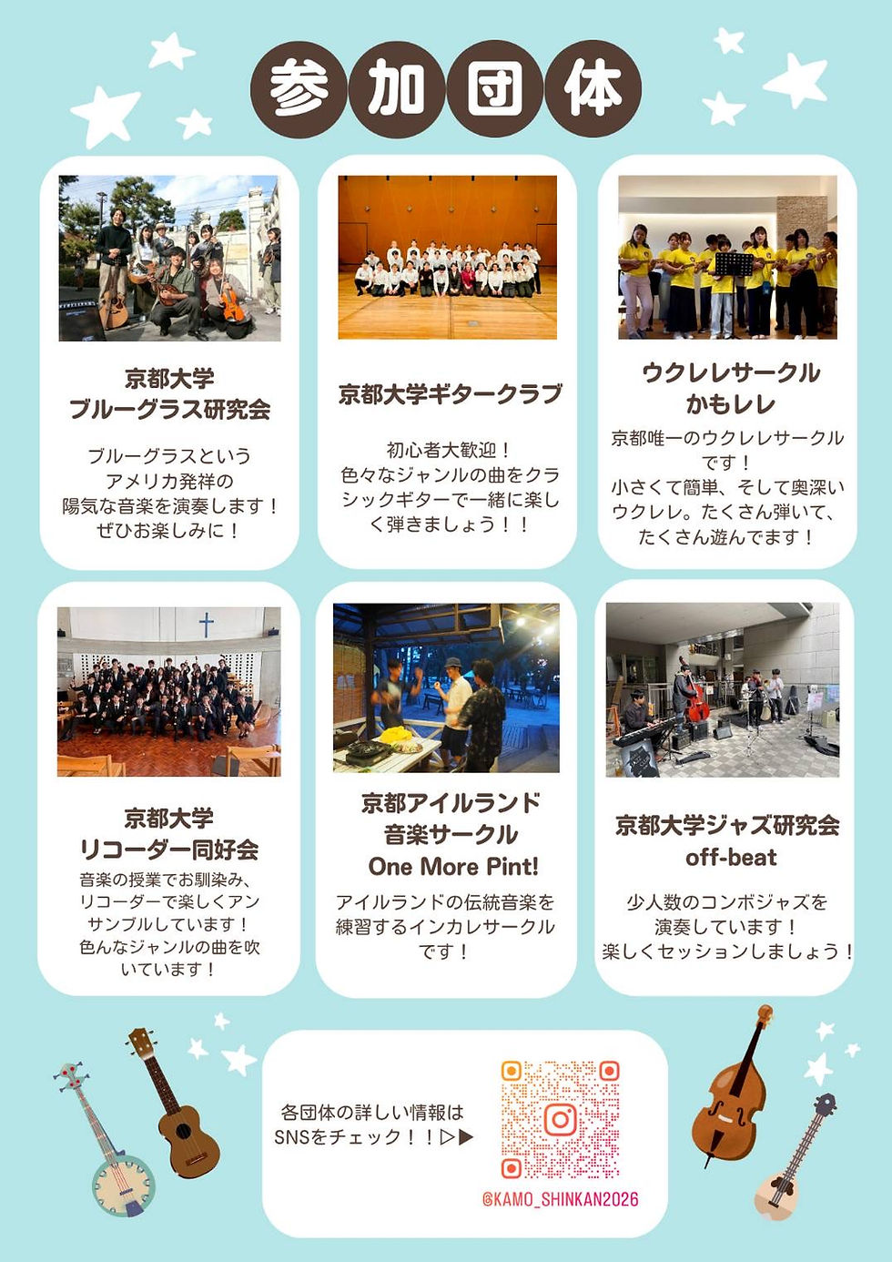 参加団体: ブルーグラス研究会・ギタークラブ・アイルランド音楽サークル「One More Pint!」・ジャズ研究会 off-beat・ウクレレサークルかもレレ・リコーダー同好会